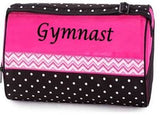 Brilliantly screen printed polka-dot design with Chevron ribbon trim. Gymnasts will “flip” for this fun design! Embroidered “Gymnast” and polka-dot ribbon trim on carry straps. Microfiber material wipes clean. Can be personalized.