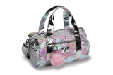 A fun and reversible pearlescent sequin duffel. Sequins reverse from pink to silver pearlescent colors. Features three outside pockets that allows for ample storage. Adjustable shoulder straps and double handles for flexibility in carrying. Made with fabric that's easy to wipe clean. Includes removable pink plush pom-pom and water-repellent inner lining. Light weight and folds flat.