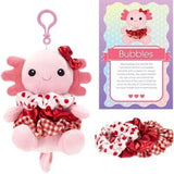 Meet Bubbles the Axolotl. Bubbles is a 6 inch plush that can also be used as a bag tag. The metallic red bow on her head matches the scrunchie tutu. Each scrunch bunch comes with a little back story and removable scrunchies. Bubbles loves romance stories and holidays!