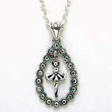 An elegant silver necklace with a large teardrop made of iridescent stones centered with a twirling ballerina.