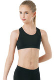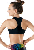 This racerback bra top is constructed of 4-way stretch matte nylon for comfort and ease of movement. Classic racerback silhouette features a scoop neckline with wide shoulder and back straps to provide maximum support for high-impact routines. A 1" elastic hem helps ensure a secure, stay-put fit, and a full front liner provides additional support.