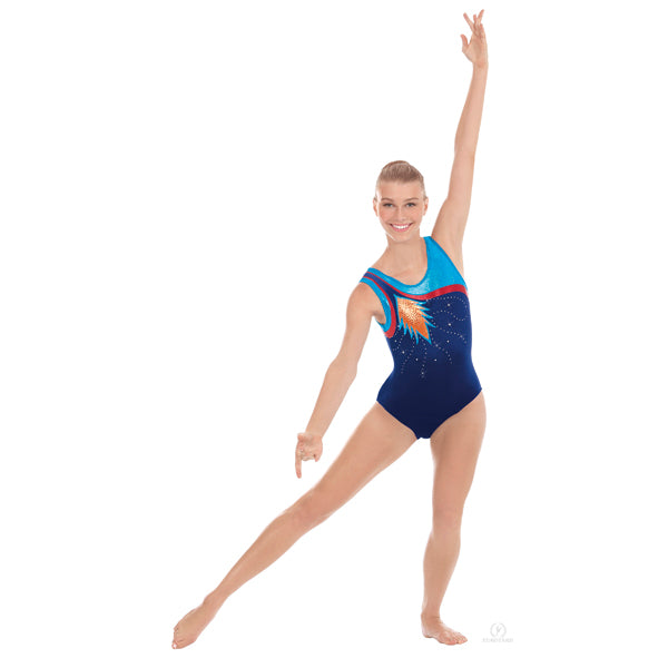 Adult Velvet and Metallic Foil Gymnastics Tank Leotard with Front to Back Sewn in Asymmetrical Design and Rhinestone Detail
