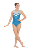 • Elite gymnastics leotard with a vivid oceanic turquoise base and silver metallic foil resembling wave caps. Light catching rhinestones are placed throughout the neckline, creating a dazzling look.