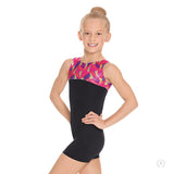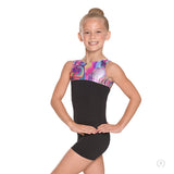 This tank gymnastics biketard flaunts a vibrant, prismatic collar accent in either Rainbow Swirl or Fuchsia Swirl. The bright, fuchsia swirl print incorporates bursts of purple and yellow and the rainbow swirl showcases a ripple effect of fuchsia, purple, yellow, blue, and green; each colorful pattern flaunts a subtle, metallic finish that shines as it catches the light. The high scoop neck, moderate scoop back, modest inseam length, and stay-put straps keep your gymnast covered, confident, and focused during practices. Soft, supportive, and flexible, the Tactel® Microfiber fabric of this biketard stretches with your little star's movements then rebounds quickly for a snug, secure fit.