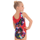 This high quality, nylon/spandex gymnastics leotard is designed to hug, fit, and move with your little gymnast. The high scoop neckline, stay-put tank sleeves, and no-ride bottom keeps her covered during her practices and meets. She'll score a perfect 10 on style with the bold, colorful, graffiti splatter print and asymmetrical, red metallic insets.